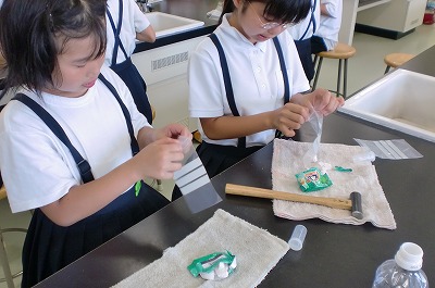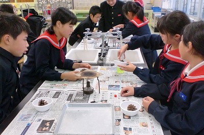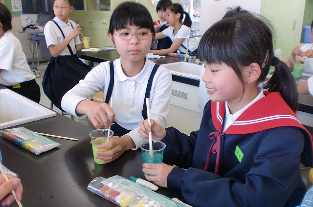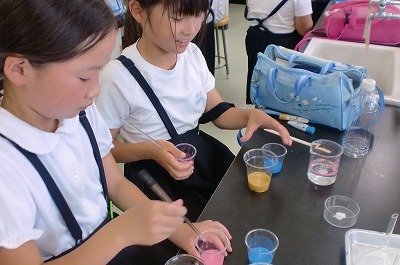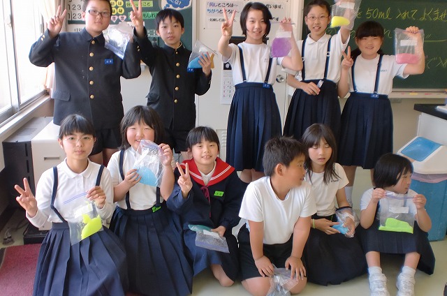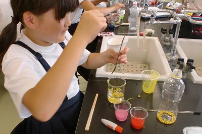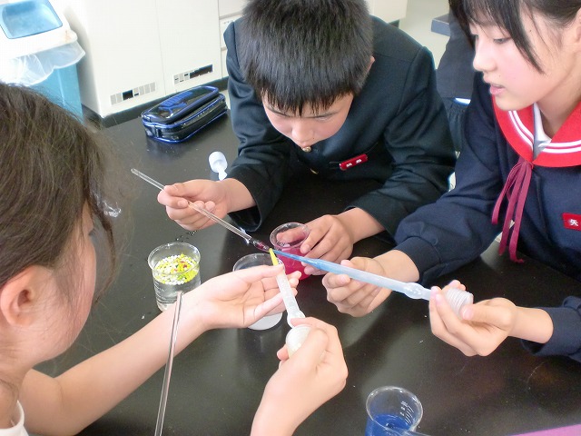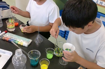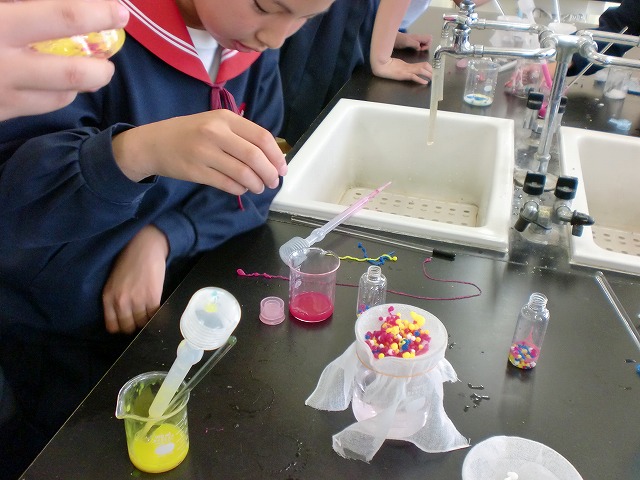 2回目の科学クラブでは、ふしぎなビーズづくりをしました。 人工イクラの作り方からアレンジして、アルギン酸ナトリウムと塩化カルシウムを つかって、ビーズをつくりました。 45分はあっという間に過ぎ去り、楽しい作品がたくさん出来上がりました。 みんなよくがんばったなあと思います。6年生、5年生が協力してできたのが とてもすてきでした。 出来上がりの時の笑顔を見れば、大変な作業もむくわれますね♪ おつかれさま~
