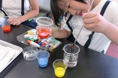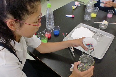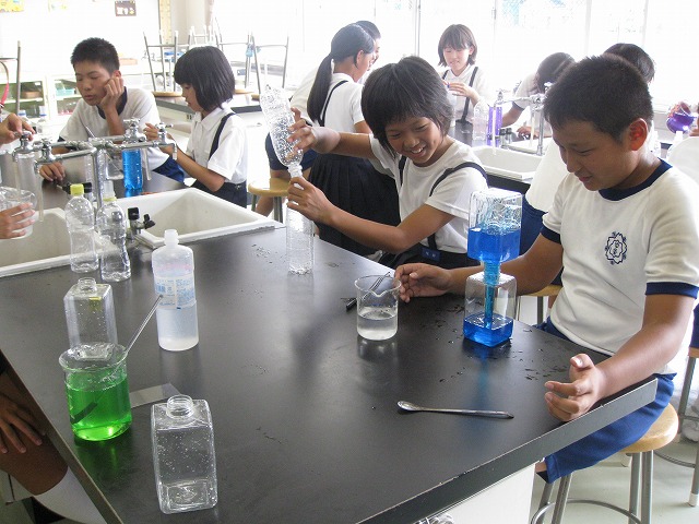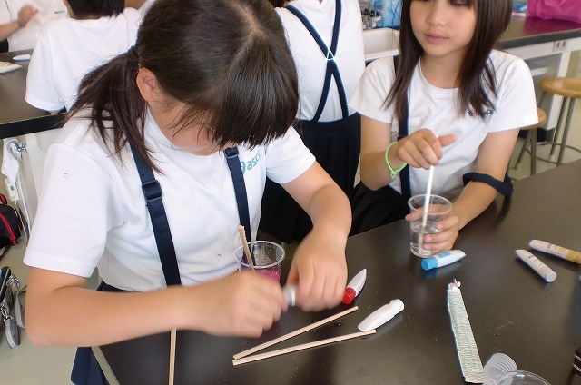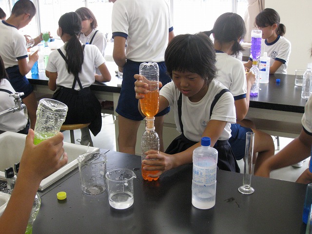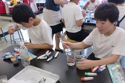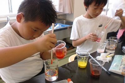 第5回 科学クラブがありました。 連休明けの科学クラブはスライム時計づくりでした。 ビーカーにPⅤAのり、水、を入れ、インクで色つけます。絵の具より透明感があって 美しく色付けできます。 それをペットボトルに注いでから、ほうさ液をいれます。 今回はほうさ液の分量を各自で考えてもらいました。 ほうさ液が少ないと →やわらかい、ドロドロ ほうさ液が多いと →かたくなる 思いどおりにいかないのが、実験の楽しさでもあります。 微妙な出来上がりにくびをかしげながらも一生懸命にとりくんでいました。