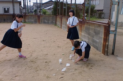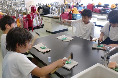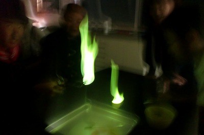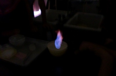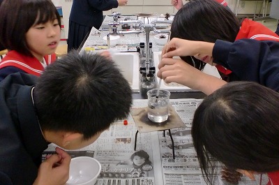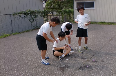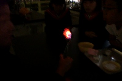 第7回 科学クラブがありました。 今回は燃焼の実験をしました。身近な薬品を燃やし、その 色を見る炎色反応の実験をしました。 花火にいろいろな色があるわけを考えました。 準備 アルコール(エタノール) 化粧用パフ ピンセット アルミ製のパット 薬品; ホウ酸 ・ ミョウバン ・ 塩化カルシウム ・ 食塩 実験の方法は簡単です 1、アルコールに薬品を染み込ませます。 2、化粧用パフにしみこませます。 3、火をつけます。 黄色…食塩を燃やしています。 黄緑色・・・ホウ酸を燃やしています。 紫色・・・みょうばんを燃やしています。 赤色・・・塩化カルシウムを燃やしています。 ふりかえりの様子です。 身近なものを燃やして火にも色々な色があることが わかって面白かったです。自分でも好きな色の火をつくれたらいいと思いました 等の意見がたくさんでました。 。