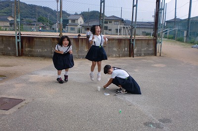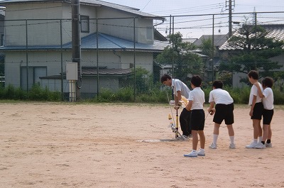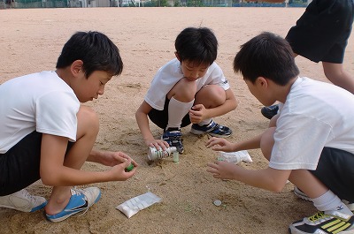 第3回 科学クラブでは フィルムケースロケット飛ばしをしました。 フイルムケースはいまどき手に入れにくくなり 理科教材のカタログに プッシュバイアルビンというものをみつけました。 発砲系の入浴剤を砕いて入れて、水を3分の1から2分の1くらい入れて ふたをして、さかさまにしておく。 25秒くらい後にポン♪と音を立てて飛びます。 発泡剤と水の関係や 飛ぶしくみなど 夏休みに自由研究してみてもいいかも・・・・ 一方となりでは 宇宙クラブが本格的に ペットボトルロケットをうちあげていました。 大成功していました。迫力がちがいました♪