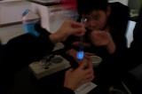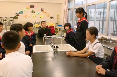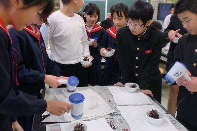 第10回科学クラブでは うみほたるの実験をしました。 おわんクラゲで、ノーベル賞を受賞した下村博士が最初に発光物質 「ルシフェリン」の結晶化に成功したのが、このウミホタルです。 今回は「乾燥ウミホタル」を使用しました。微量ですがとても・・・貴重なものです。 乳鉢ですりつぶし、そこに少量の水を加えると 青白く発光します。 試験管を振ったり、棒でかき混ぜると強く光りました。 発光している時間はほんの1,2分ですが・・・・ とても、とても幻想的なひと時でした。
