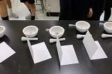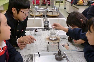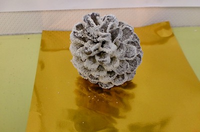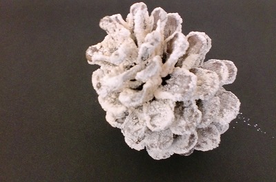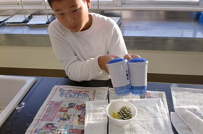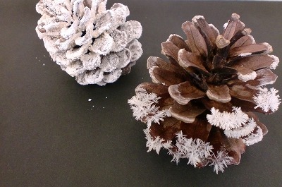第8回科学クラブは尿素の結晶で まつぼっくりに雪をふらせようでした。 尿素と水を1対1の割合で溶かします。 魔法の液体・・・洗剤、PVAのり・クレンザー5,6滴を入れます。 この液体をまつぼっくりにスプレーします。 思いつきで、色をつけた班もありました。 反応を早めるために、ドライヤーで乾かします。 こんな感じで白く染まりました。 ドライヤーを使わずに自然乾燥させると、雪の結晶のように成長します(右) しかし、まつぼっくりをしめったまま放置しておくと、なんとびっくり★ 閉じてしまいます! 晴れた日に、日向ぼっこさせるとゆっくり開いて、もとにもどります。 みんな持ち帰った後、びっくりした人もいたのではないでしょうか・・・