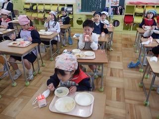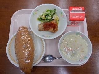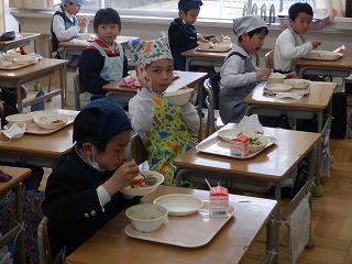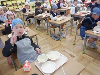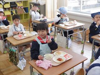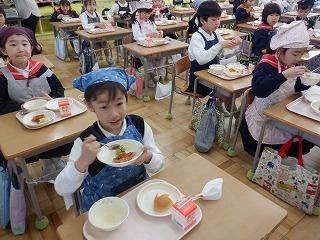 3月24日(金)今年度最後の給食は「チーズクッペ・豚肉のトマトソース・ミモザサラダ・コーンポタージュ」でした。ミモザの花言葉は「感謝」だそうです。在校生みんなで、今年1年元気に頑張ることができたことに感謝しながら、調理員さんたちが作ってくださったおいしい給食をいただきました。可愛いエプロン姿の1年生も、みんな笑顔でおいしそうに食べていました。