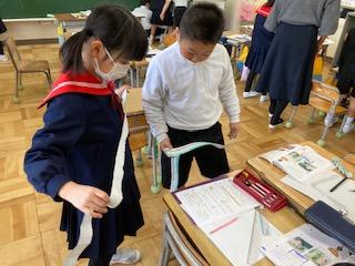 2月3日(金)2年2組の算数の時間、子ども達は1mの「テープものさし」を使っていろいろなものの長さを測定していました。身の回りにあるものの長さに関心をもち、量の感覚を身に付け、日常生活で生かすことが目的の活動です。子ども達は、友達と協力しながら、楽しそうに取り組んでいました。