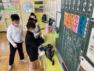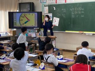 2月8日(水)1年1組の算数の時間は、時計を使って「なんじなんぷん?」の学習していました。子ども達は、算数セットの時計を手に、短い針と長い針の読み方をみんなで確かめながら、一生懸命考えていました。