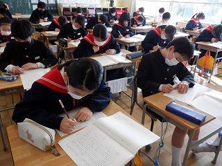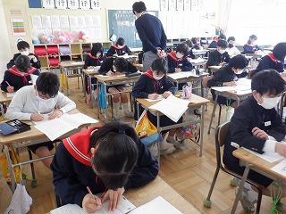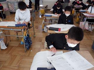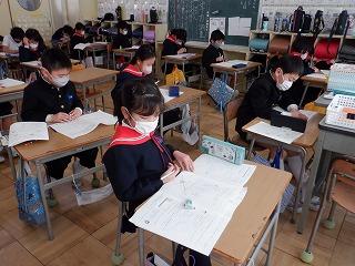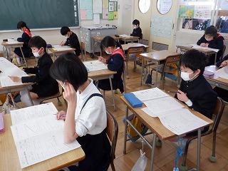 5年生が、2月7日(火)に国語と算数の、8日(水)には社会と理科の町学力実態調査にチャレンジしました。2日間かけての取組となりましたが、12月の学力調査でよい結果を残した5年生は、今回もじっくりと問題に向き合い取り組んでいました。真剣に挑む表情からも、今年1年の頑張りと成長が伝わってきました。