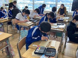3月7日(火)5年1組の子ども達が、算数の時間に方眼紙を使って三角柱と円柱を作っていました。どの子も、底面や側面の形に気を付けて展開図を描き、丁寧に切り取って上手に作っていました。