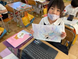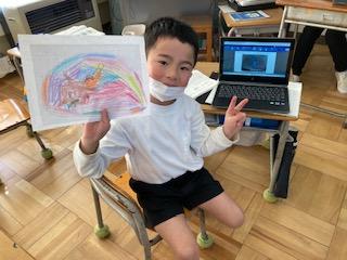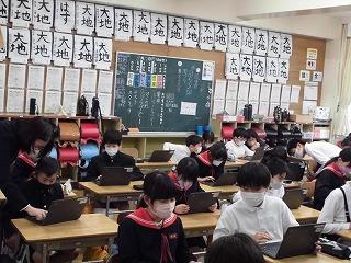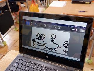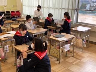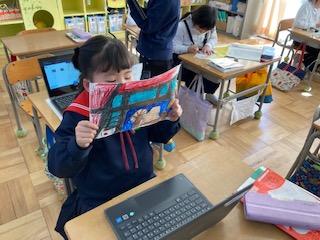 2月6日(月)1年1組の子ども達が、国語の物語文「たぬきの糸車」の1場面を紙芝居にして、クロームブックに録画撮影をしていました。自分で描いた絵と文を友達にも紹介しようと、とても楽しそうに取り組んでいました。