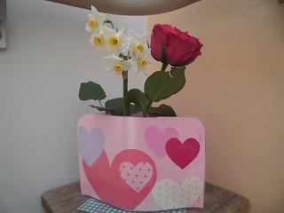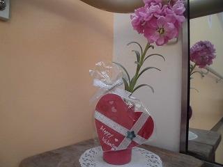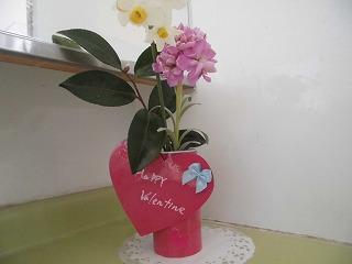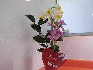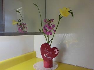 本日2月14日はバレンタインデー。お花ボランティアの中西さんが、一輪挿しの飾りを変えて新しいお花に生け代えてくださいました。ハートマークに心が癒されます。いつもありがとうございます。