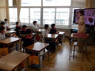 2月14日(火)バレンタインデーに、2年1組の子ども達が、アメリカでのバレンタイン文化についてALTの話を聞いていました。この日に合わせて可愛いハートのカチューシャを付けたALTの話に、子ども達は興味をもって聞いていました。違う国の文化を学ぶよい機会になりましたね。