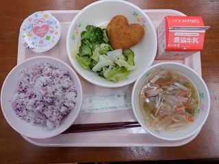 ちなみに、14日(火)の給食は、「ゆかりごはん・ハートのコロッケ・グリーンサラダ・コンソメジュリアン・ハート形のチョコプリン・牛乳」のバレンタイン献立でした!