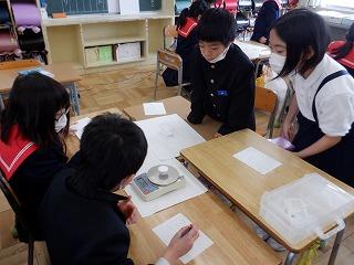 2月14日(火)3年1組の子ども達が、塩と砂糖を使って、同じ体積の塩と砂糖の重さは、同じか違うのか予想を立てて実験をしていました。実際に体験を通して分かった結果は、記憶に残りやすいですね。子ども達は、グループごとにしっかりと確認したり協力したりしながら、楽しく実験を行っていました。
