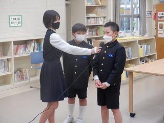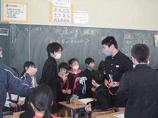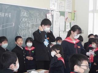 2月16日(木)明日の卒業を祝う会を前に、1年生がなかよし班の6年生に感謝の気持ちを込めて作ったペンダントを渡していました。6年生は、1年生からのかわいいプレゼントに少し照れくさそうにしながらも、笑顔で受け取っていました。
