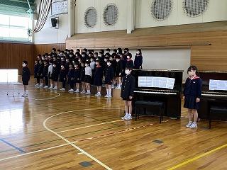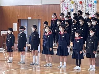 3月24日(金)3限目に、3~5年生が体育館に集合し、1・2年生はリモートで修了式を行いました。会場は別でしたが、全校児童で元気に校歌を歌い、式が始まりました。