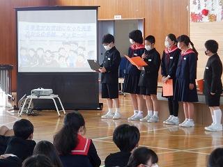 最後に、読書賞の表彰がありました。5年代表児童が学校長から賞状を受け取り、全校児童に向けて読書のよさを伝えました。