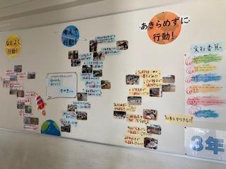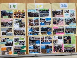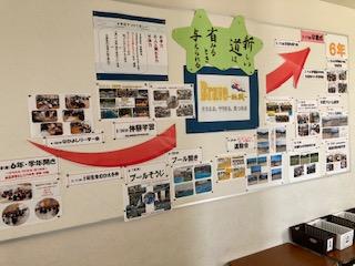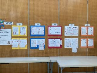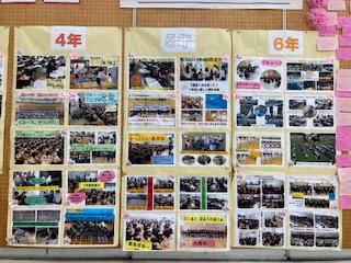 本校自慢のプレールームでの学校掲示です。全学年の頑張りが掲示され、迫力いっぱいです。休み時間には、子ども達がいつも楽しそうに見ています。