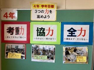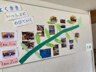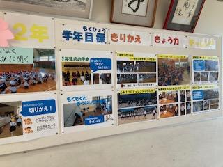 学年掲示板では、各学年の1年間の成長の足音が分かるように掲示されています。どの学年もよい目標を立て、今も頑張り続けています。