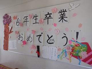 卒業式準備の6年教室飾り担当の5年生が、お祝いの気持ちを込めて黒板アートに挑戦しました。3クラスとも素晴らしいアートで、担任からのメッセージも添えられていました。保護者の皆様に見ていただけなかったのは残念でしたが、6年生は、きっと喜んで見てくれたことと思います。6年生の皆さん、卒業おめでとう!