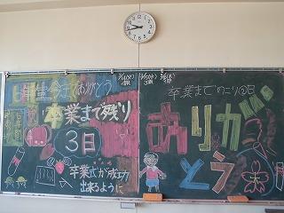 卒業式準備の6年教室飾り担当の5年生が、お祝いの気持ちを込めて黒板アートに挑戦しました。3クラスとも素晴らしいアートで、担任からのメッセージも添えられていました。保護者の皆様に見ていただけなかったのは残念でしたが、6年生は、きっと喜んで見てくれたことと思います。6年生の皆さん、卒業おめでとう!