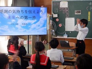 3月22日(水)4年2組の子ども達が、総合の学習で作成した10年史のプレゼン発表を行い、最後に友達に感謝の気持ちを伝えていました。どの子も「楽しかった!」「ありがとう!」「またこのメンバーで勉強したい!」など、今年1年なかよく協力して過ごした充実感が伝わる言葉で感謝の気持ちを伝えていました。クラスみんなで成長できた1年だったから、楽しい思い出がたくさんできましたね。