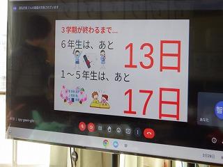 2月28日(火)朝学習の時間に、生徒指導担当から3月の中条っ子目標の取組について話がありました。今年度最後の取組となる今月の目標は、「1年間の生活をふりかえろう」です。リモートでの説明でしたが、子ども達は、スライドを見ながら1年間を振り返り、取組の目的や方法をしっかりと聞いていました。