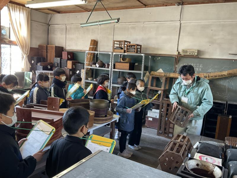2月28日(火)3年生が、社会科の学習で「吉倉収蔵庫」を見学しました。吉倉収蔵庫には、津幡町から集められた生産や生活のための道具を中心とした各種資料がたくさん保存されていました。子ども達は、普段自分たちが使っている生活用品と比べながら見学し、昔の人々の生活について考え、学習をより深めていました。