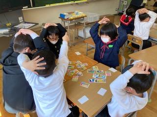 3月2日(木)1年2組の子ども達が、グループになってかるた遊びをしていました。頭に手を当て、担任の先生が読む読み札に耳を傾けながら、真剣な表情で絵札を取って楽しんでいました。