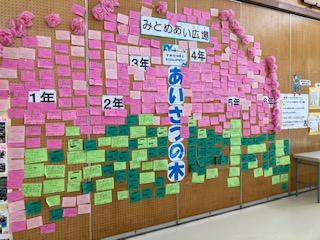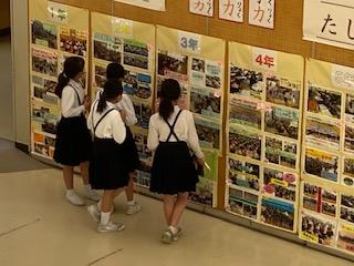 本校自慢のプレールームでの学校掲示です。全学年の頑張りが掲示され、迫力いっぱいです。休み時間には、子ども達がいつも楽しそうに見ています。