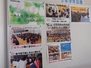 学年掲示板では、各学年の1年間の成長の足音が分かるように掲示されています。どの学年もよい目標を立て、今も頑張り続けています。