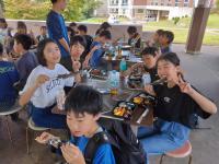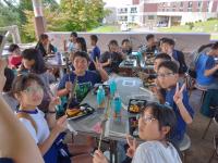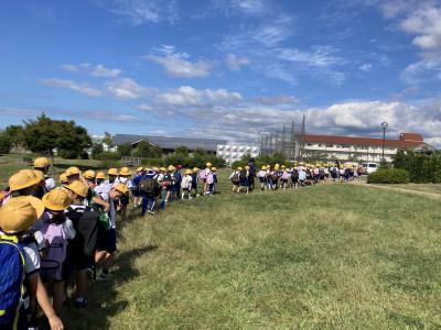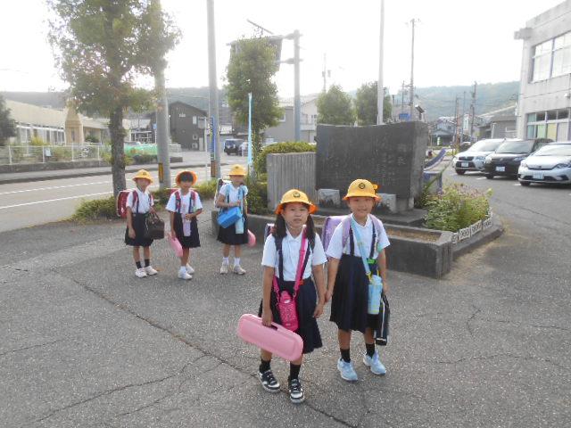 本校では、台風10号の今後の進路予測が困難なため、8月30日の時点で、今日(9月2日(月))の給食は停止となりました。それに伴い、今日は、4限目まで授業をし、下校時の安全のため、集団で下校しました。