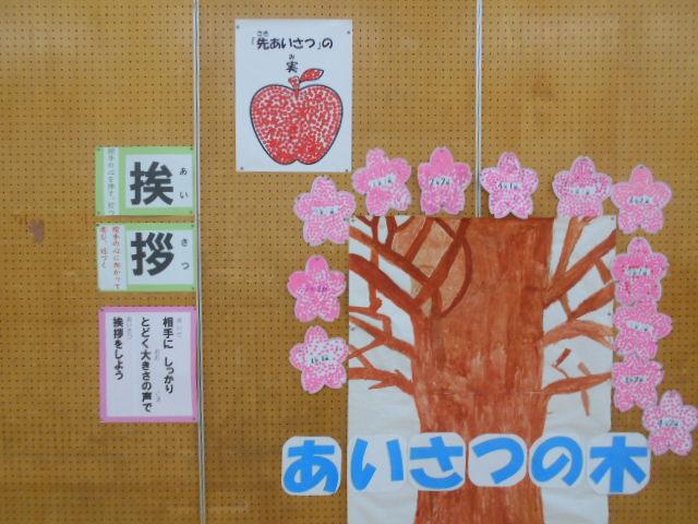 合言葉は<あいさつの実を実らせよう[あいさつの声・相手の目・先あいさつ・会釈]>です。