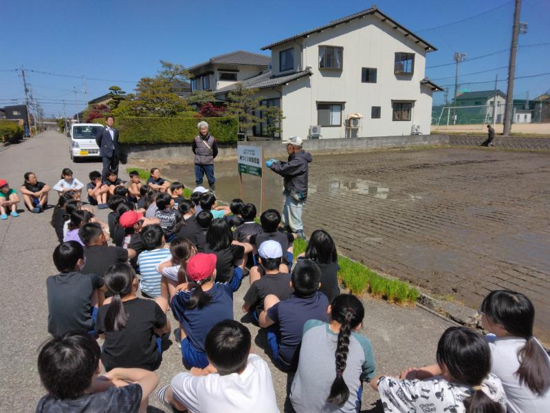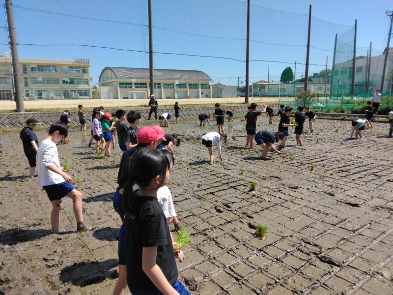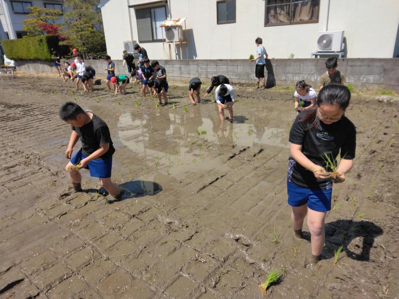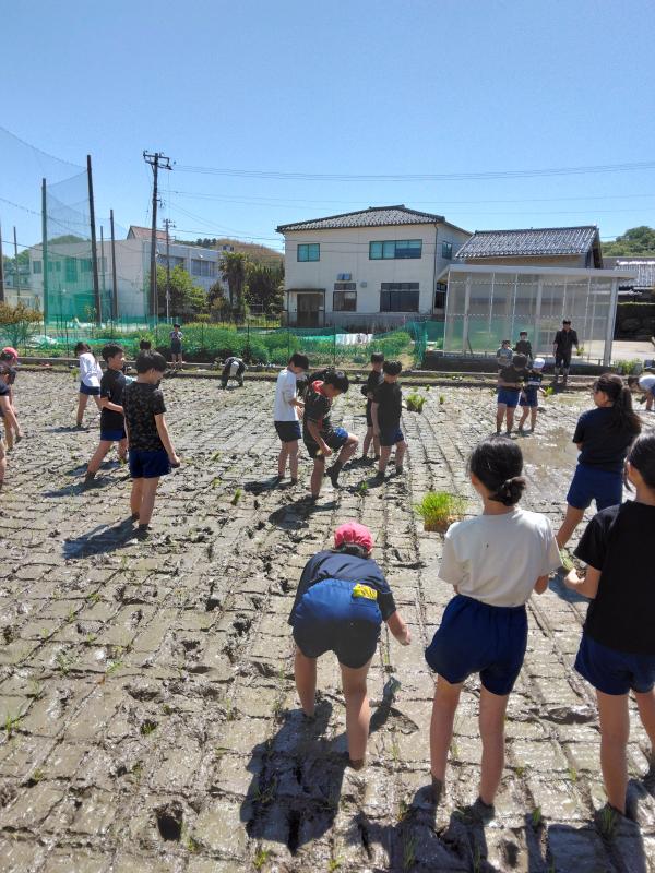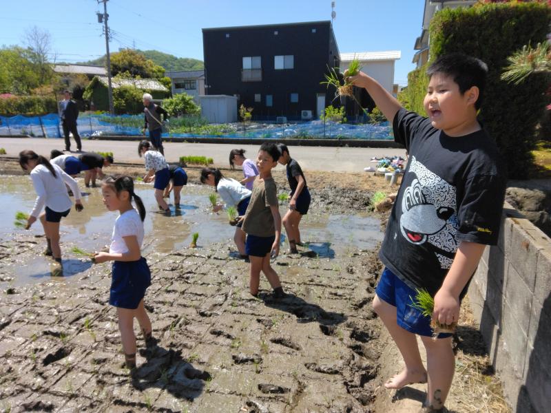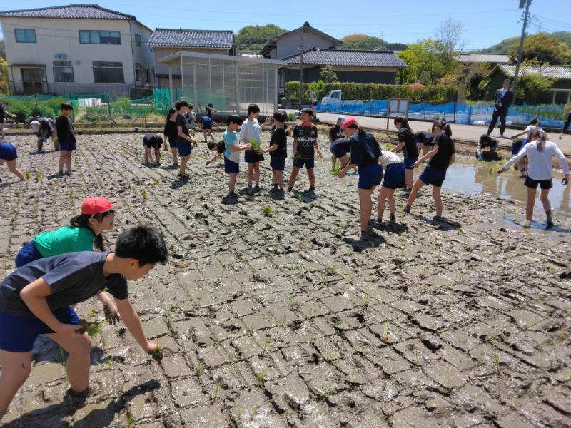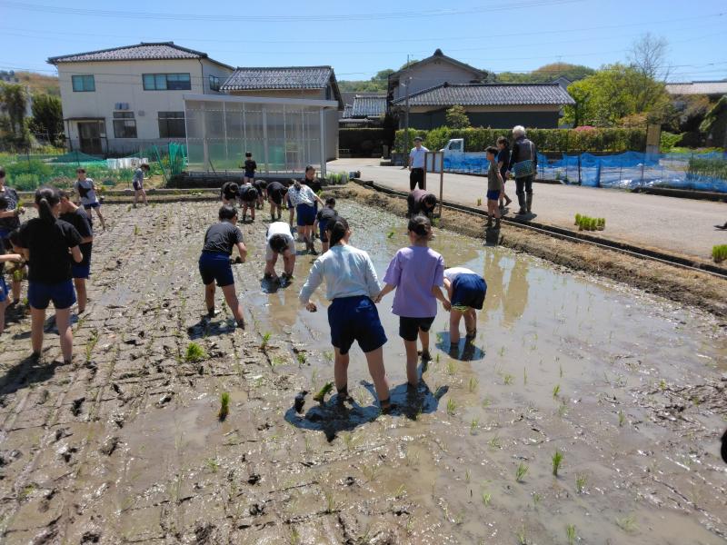 今日は地域の方々にご協力いただき、学校のすぐそばの水田で田植えを体験しました。
