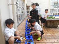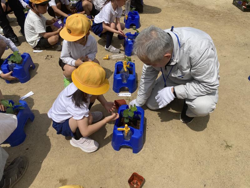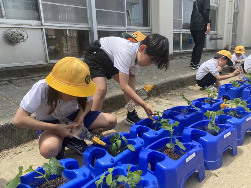 5月15日に生活科の授業で野菜の苗植えをしました。野菜名人の先生をお呼びし、苗植えの仕方や育て方、野菜について教えていただきました。自分で選んだ野菜の苗を優しく大事に植えることができました。野菜クイズも盛り上がり、知らない野菜についても詳しく知ることができました。これからのお世話を続け、実がなるように頑張っていきます。