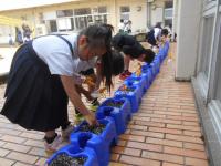 環境委員会の活動の一環として,玄関前と小運動場にベゴニアと日日草の花の苗を植えました。