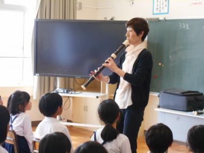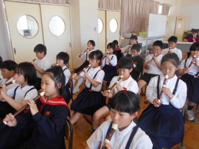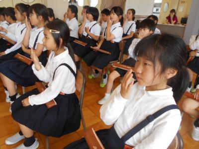 講習では,「息・舌(タンギング)・指使い」の3つのポイントについて教えていただきました。講習の最後にはいろいろな種類のリコーダーが紹介され,子供達は自然とリコーダーに合わせて歌い,楽しいリコーダーとの出会いの時間になりました。
