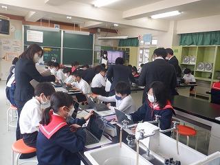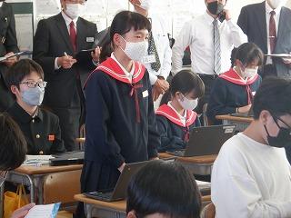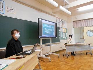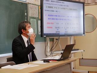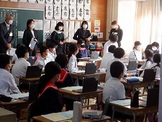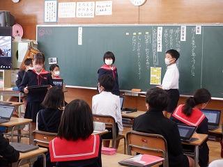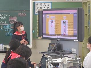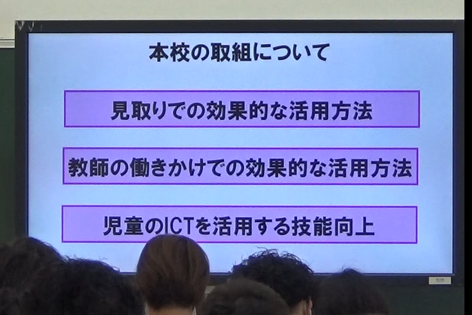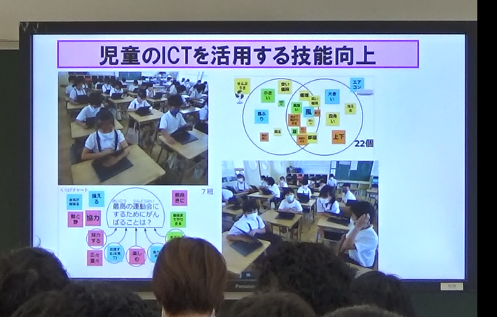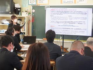 公開授業前の全体会・概要説明では、GIGA推進リーダーが、GIGAスクール構想強化事業のモデル校としての取組について報告し、参加してくださったたくさんの先生方に本校の取組を発信することができました。