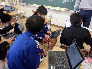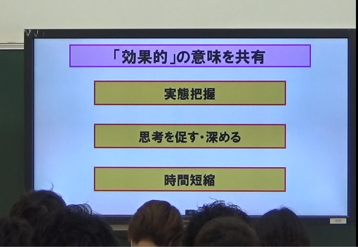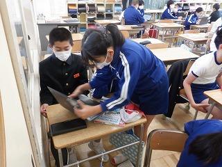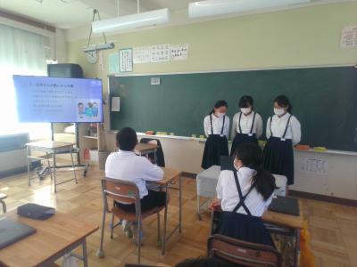 ICTを効果的に活用する場面では、自分達の学級会の様子をイヤホンを付けて聞いていました。話し合い活動での良い話し方・聞き方について、一人一人しっかりと考えている姿が素敵でした。