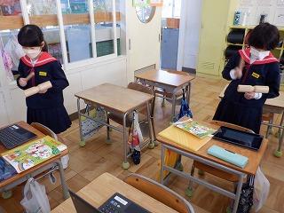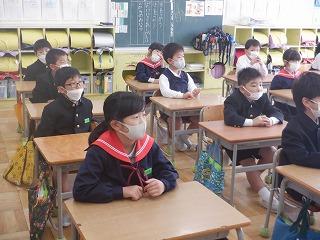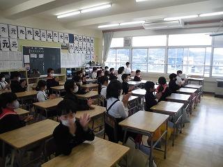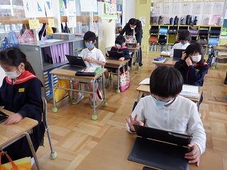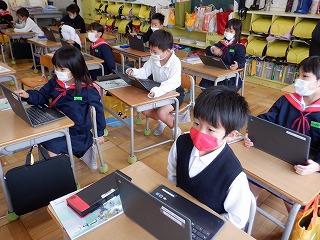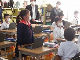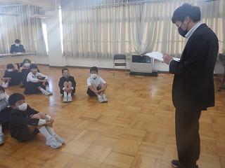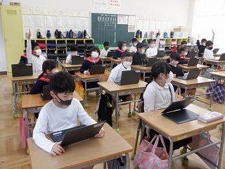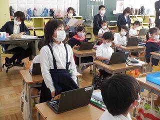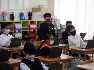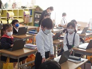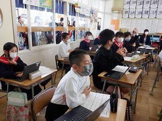 学校長からは、10月末に行われた本校でのICT公開発表会での良い姿の紹介があり、GIGAスクール構想のもと、ICTを遊びだけでなく学習に使えるようにさらにレベルを上げていこうと話がありました。子ども達は、各教室でしっかりと背筋を伸ばして聞いてくれていました。