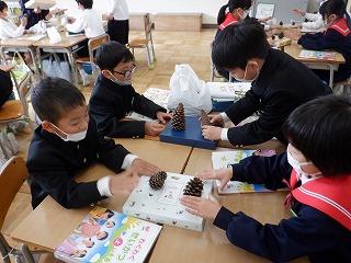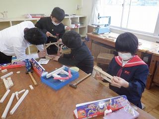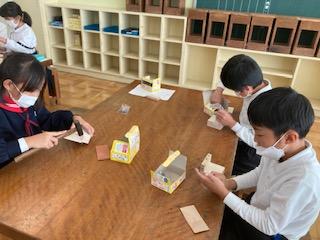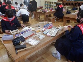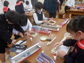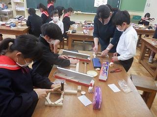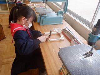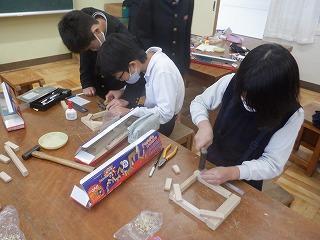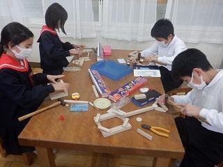 12月2日(金)4年2組の子ども達が、図工の時間に金槌とのこぎりを使って作品作りをしていました。4年生になって、初めてのこぎりを扱う題材なので、のこぎりを使う時には、2人組でしっかりと押さえながら安全に気を付けて活動していました。