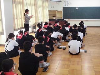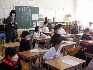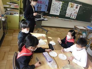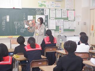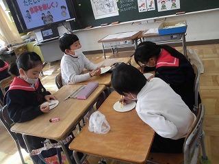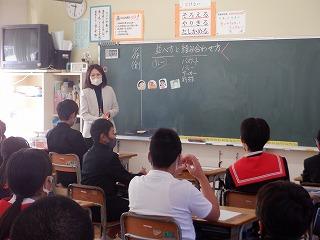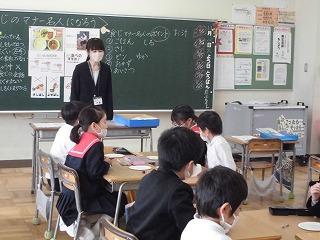 11月22日(火)町の栄養教諭の先生から、2年生は食事のマナーについて学びました。みんなで食事をするときにはマナーを守ることが大事だということに気付き、食事の時の姿勢やお茶碗の正しい持ち方等を教えてもらいました。
