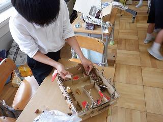 一方、くぎ打ちグループの子ども達は、3年生の時に全員体験しているので、どの子も集中して作業し、教室にはギコギコトントンというのこぎりと金槌の音だけが響いていました。