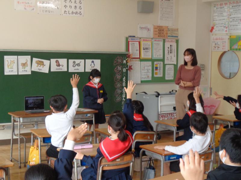 11月22日(火)2限目、2年2組の子どもたちが、ALTと一緒に英語を使って活動しました。動物の鳴き声が、日本と外国で違うことを知り、とても驚いていました。ジェスチャーで動物を表現し、何の動物かを英語で答えるクイズでは、どの子も積極的にジェスチャーを交えて伝え、みんなでクイズを楽しみました。