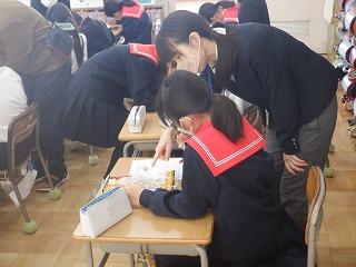 1組の様子です。友達と相談したり栄養教諭の先生にアドバイスをもらったりしながら、自分の考えを書いていました。