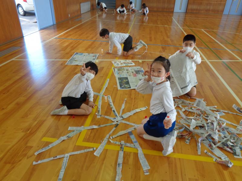 11月28日(月)5限目、2年生の子ども達が、図工の「つないで つるして」の学習をしました。子ども達は、班で協力して話し合いながら、材料の新聞紙を細く切って、思い思いの形につないだり吊るしたりして作品を仕上げました。広い体育館での活動だったので、どの子も生き生きと取り組み、後半は、みんなでジャンケン列車をして、笑顔がはじけていました。この日は、居住地交流として、いしかわ特別支援学校から交流に来てくれた中田くんも「とっても楽しかったです。」と、中条っ子との交流を楽しみました。