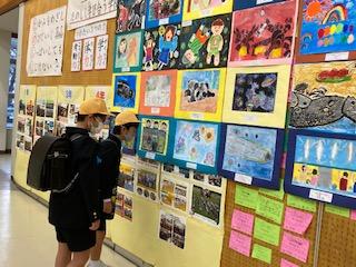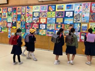 11月30日(水)12月1日(木)の2日間、本校プレールームで河北郡市小学校中学年の各学校代表の図画作品を展示しています。今朝登校した児童たちは、早速友達と作品を鑑賞していました。