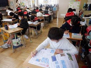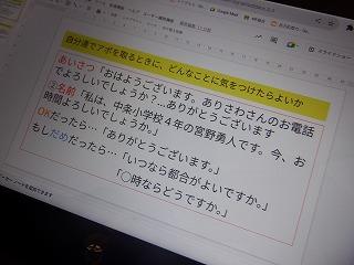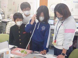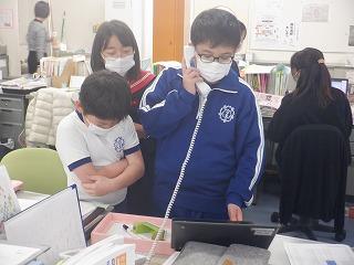 12月5日(月)4年生が、総合で作成した環境を守るためのポスターやリーフレットを地域の方々に発信するため、職員室で協力依頼の電話をかけていました。自分たちの願いをかなえるため、自分たちで直接お願いする活動です。子ども達は、地域の方に協力してもらおうと、自分たちで作成した原稿をもとに、緊張しながら丁寧な言葉で伝えていました。