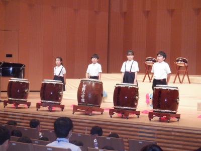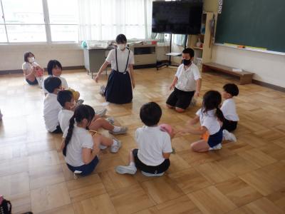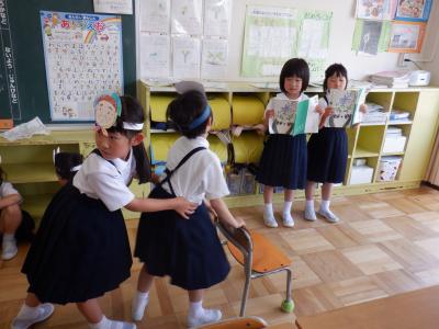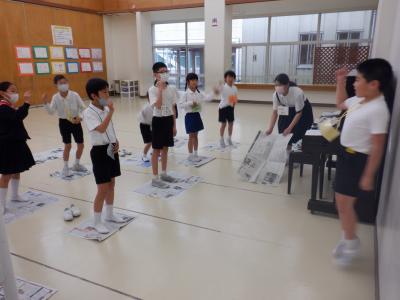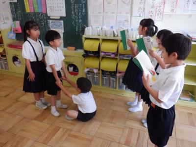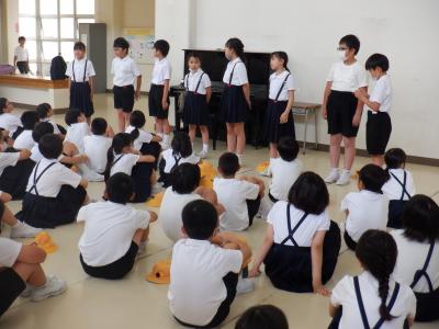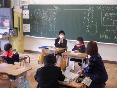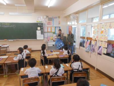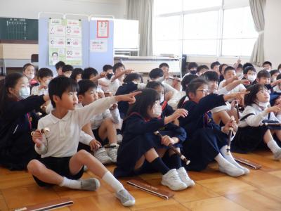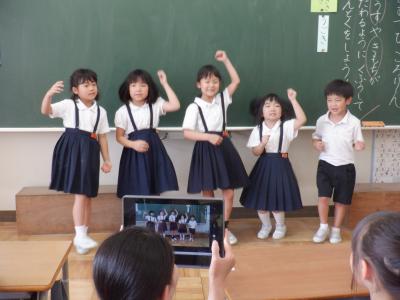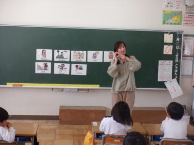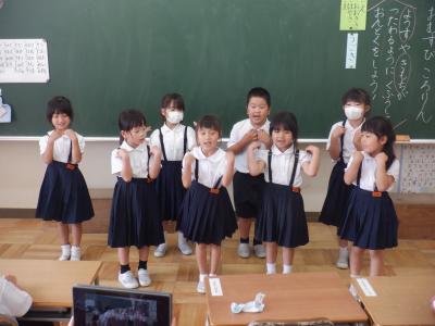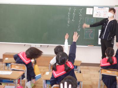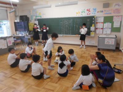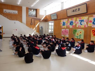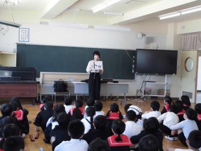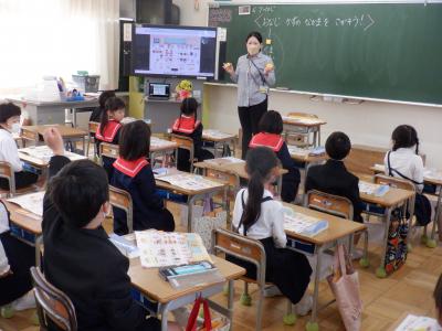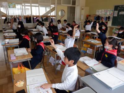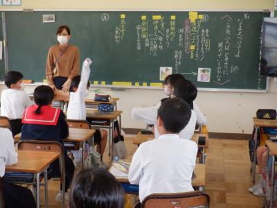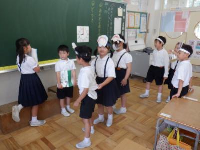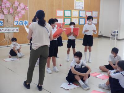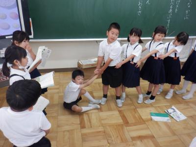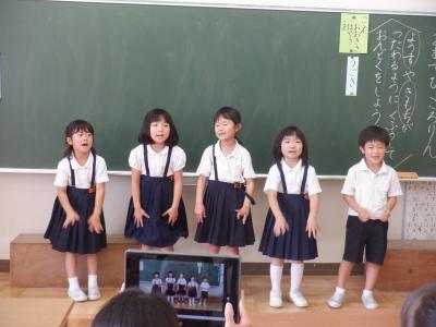 1年生は、国語「おむすびころりん」の音読を、動きなどを工夫して様子が伝わるように発表していました。