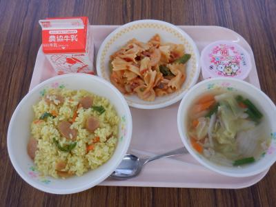 13日(木)、1年生の給食が始まりました。今日は、入学・進級お祝いメニューの「カレーピラフ・リボンパスタのトマトソース・春キャベツのポトフ・いちごゼリー」でした。