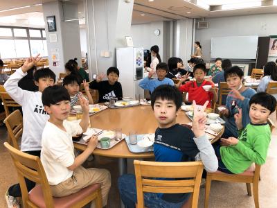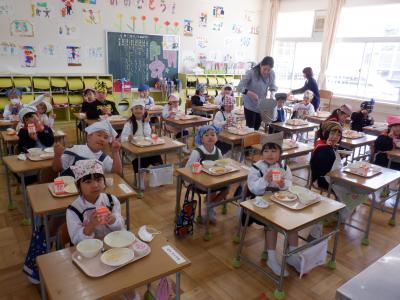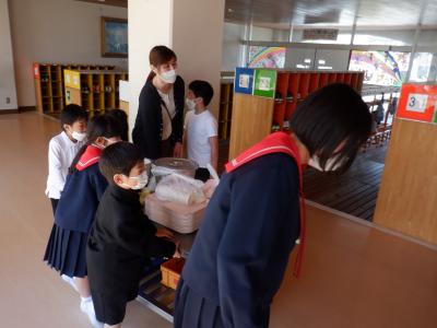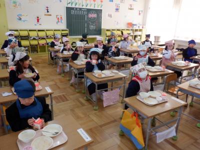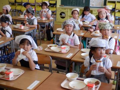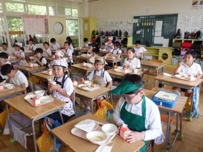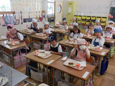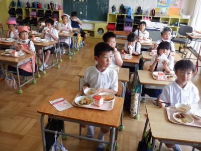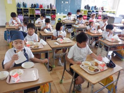 「おいしかった」と言って、完食している1年生がたくさんいました。配膳や片付けは、6年生に協力してもらいました。夏の暑い日も冬の寒い日も一所懸命に調理してくださる調理員さんや、手伝ってくれる6年生に感謝しながら、食べたいですね。