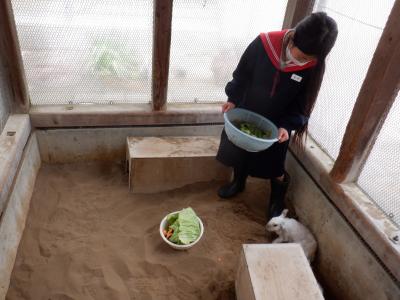 飼育委員は、手慣れた様子でうさぎに餌をあげていました。